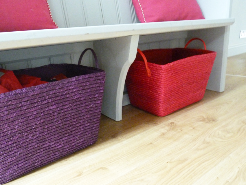 HATS, WATERPROOFS ETC: In the purple basket (from Homebase) under the pew so there’s no scrabbling around looking for them when we’re off to the park. I’ve stored winter hats away for the warmer months (although the recent weather has made me question the wisdom in this).