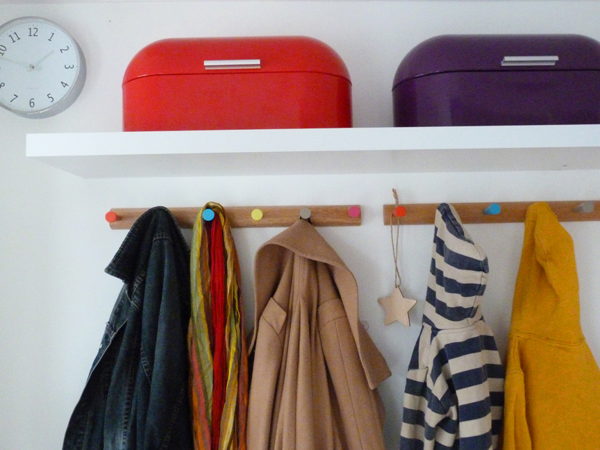 COATS: These live on the coat hooks (from John Lewis), where they dry off quickly thanks to the radiator below. The twins have a low-level hook each to keep their own coats and lunch bags within their reach.