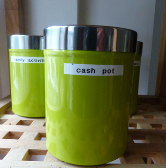 KEYS, SPARE CHANGE ETC: We pop these in a basket higher up on the shelving unit (so small people can’t reach them). The loose change is separated into tea, coffee and sugar canisters from Habitat (I keep a different pot for each of our main cash expenses).