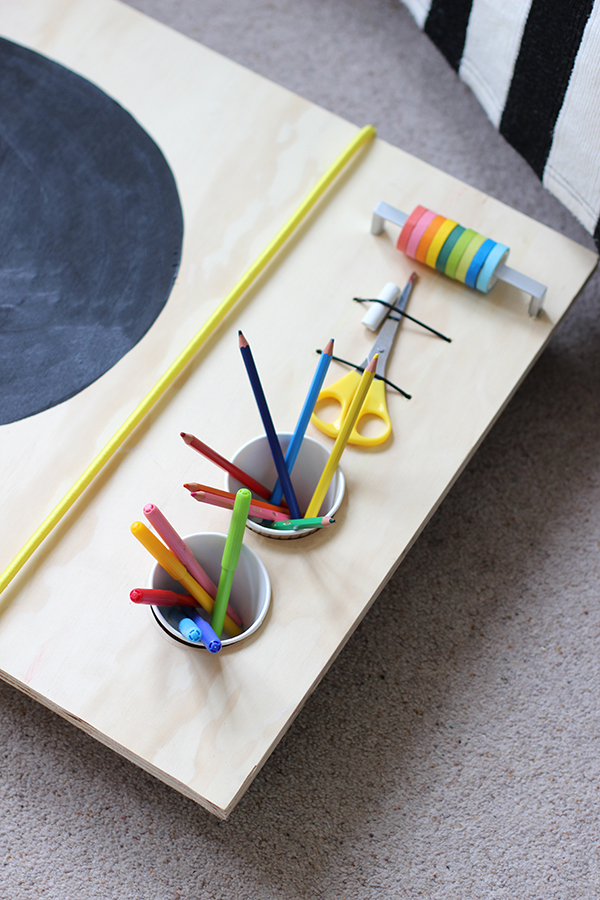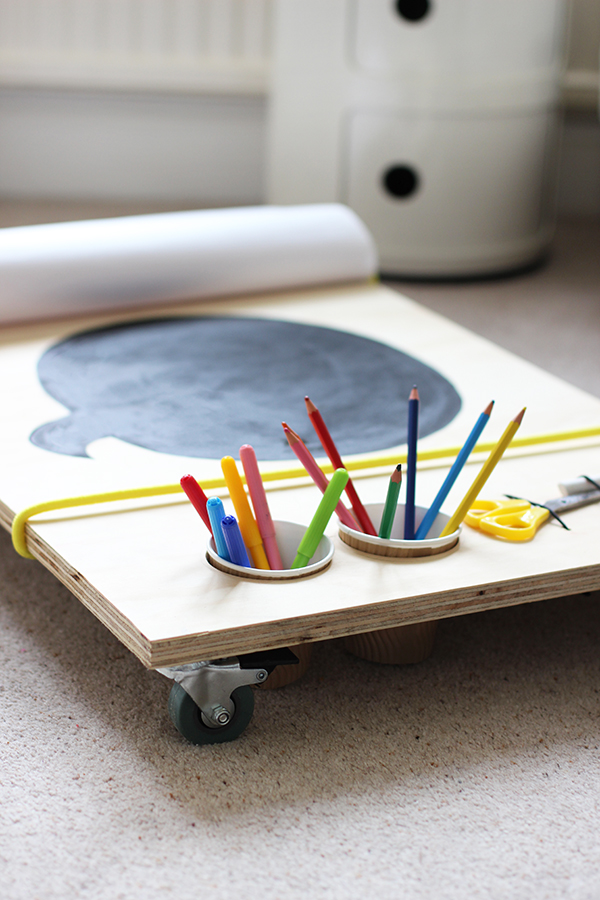 The twins (age six) like to draw all the time. They’ve moved away from colouring books, and instead produce endless drawings, collages and illustrated ‘books’. Although they each have a desk in their room, they actually enjoy drawing and creating together, so I wanted to create a surface for them with space for two, that could be stored away under their beds when not in use. We had some plywood leftover from the various DIY projects in their bedrooms, and I realised it really wouldn’t be hard to turn some of it into low tables, just by adding some casters. A few simple additions, and we’ve got a compact art station, with space for all their everyday crafting essentials – pens, pencils, scissors and washi tape.
